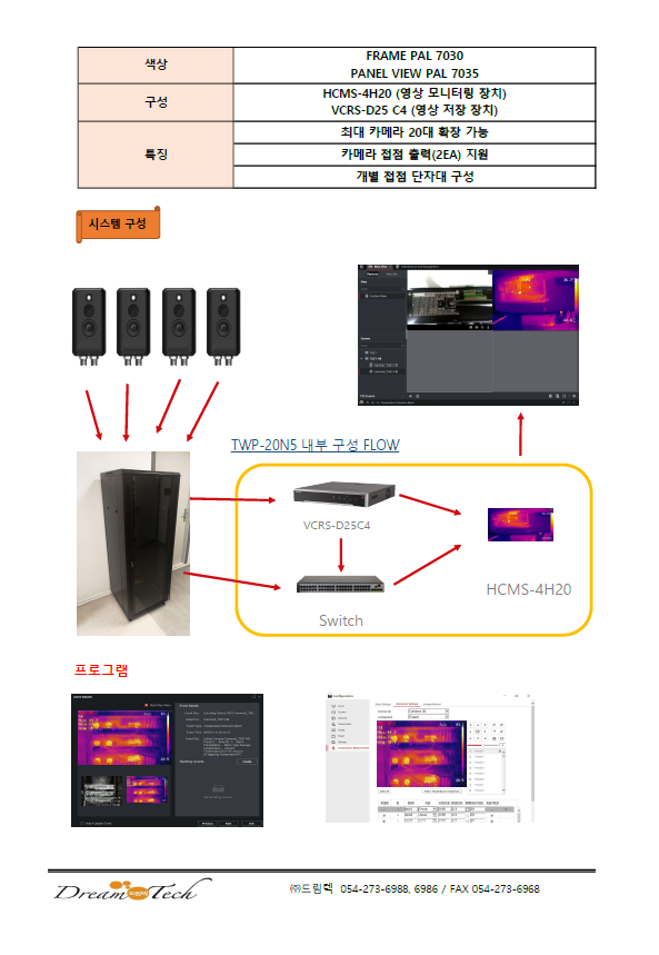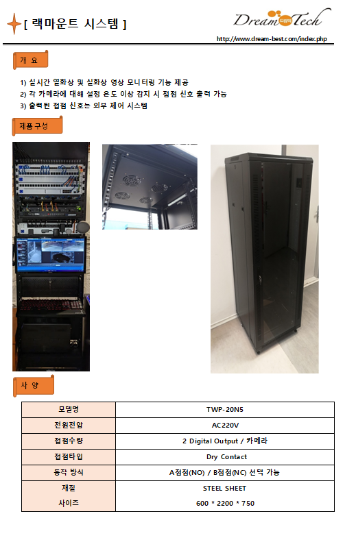 랙마운트시스템(TWP-20N5) 페이지 정보 글쓴이 관리자 작성일2025-09-17 14:55 다음글 목록 답변 본문 1) 실시간 열화상 및 실화상 영상 모니터링 기능 제공2) 각 카메라에 대해 설정 온도 이상 감지 시 접점 신호 출력 가능 3) 출력된 접점 신호는 외부 제어 시스템 다음글 목록 답변